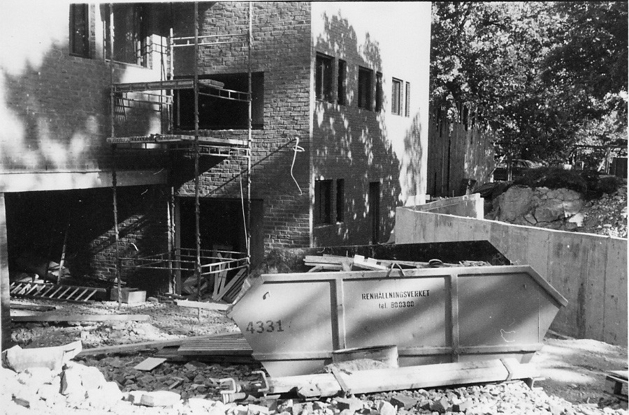 'Tillbyggnaden 1 oktober 1979. Södra ytterväggen tillbyggnaden. Ingång ''varumottagning'' syns till vänster i bilden. Container ''Renhållningsverket tel. 800300''. :: :: Ingår i serie med fotonr. 5527:69-216.'