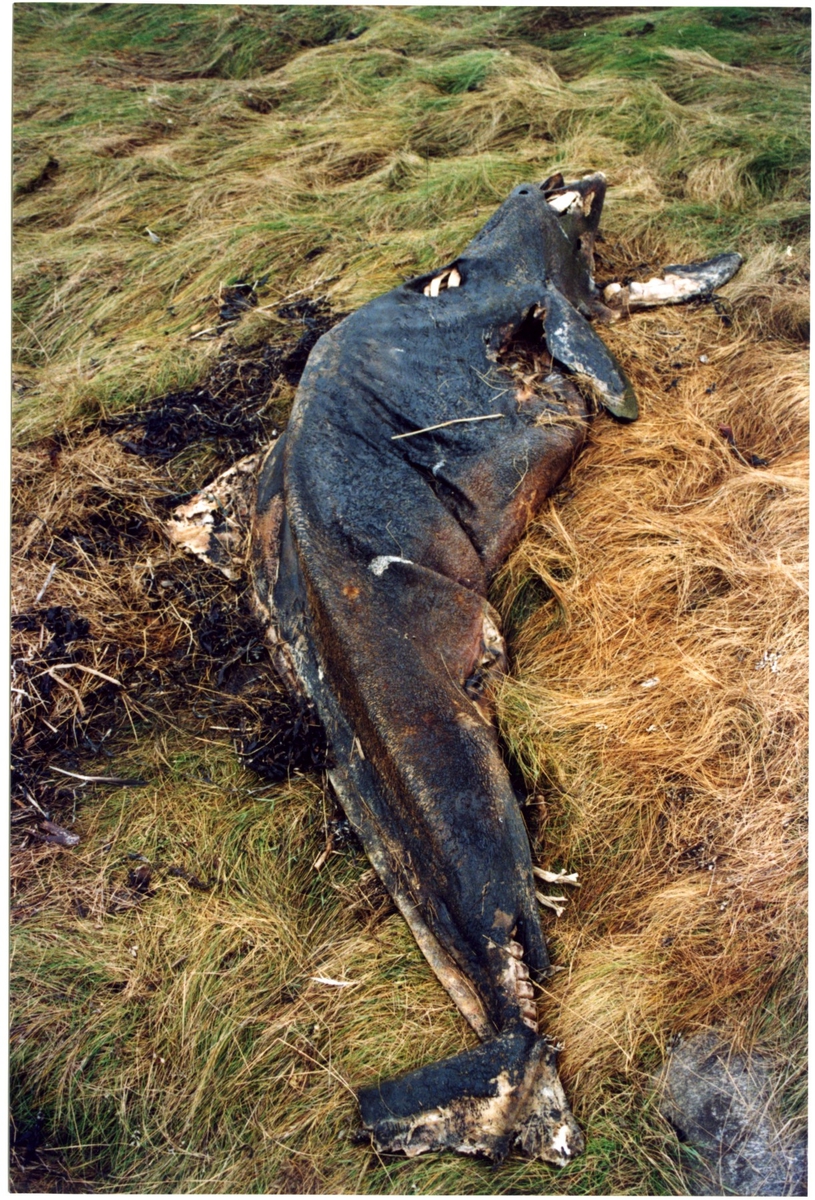 'Strandad och torkad Vitnosdelfin fotograferad på fyndplatsen: :: :: Helbild på kroppen, liggande i gulnat högt gräs. Sedd från bakdelen. En del av skelettet synligt. :: :: Ingår i serie med fotonr. 6072:1-8.'