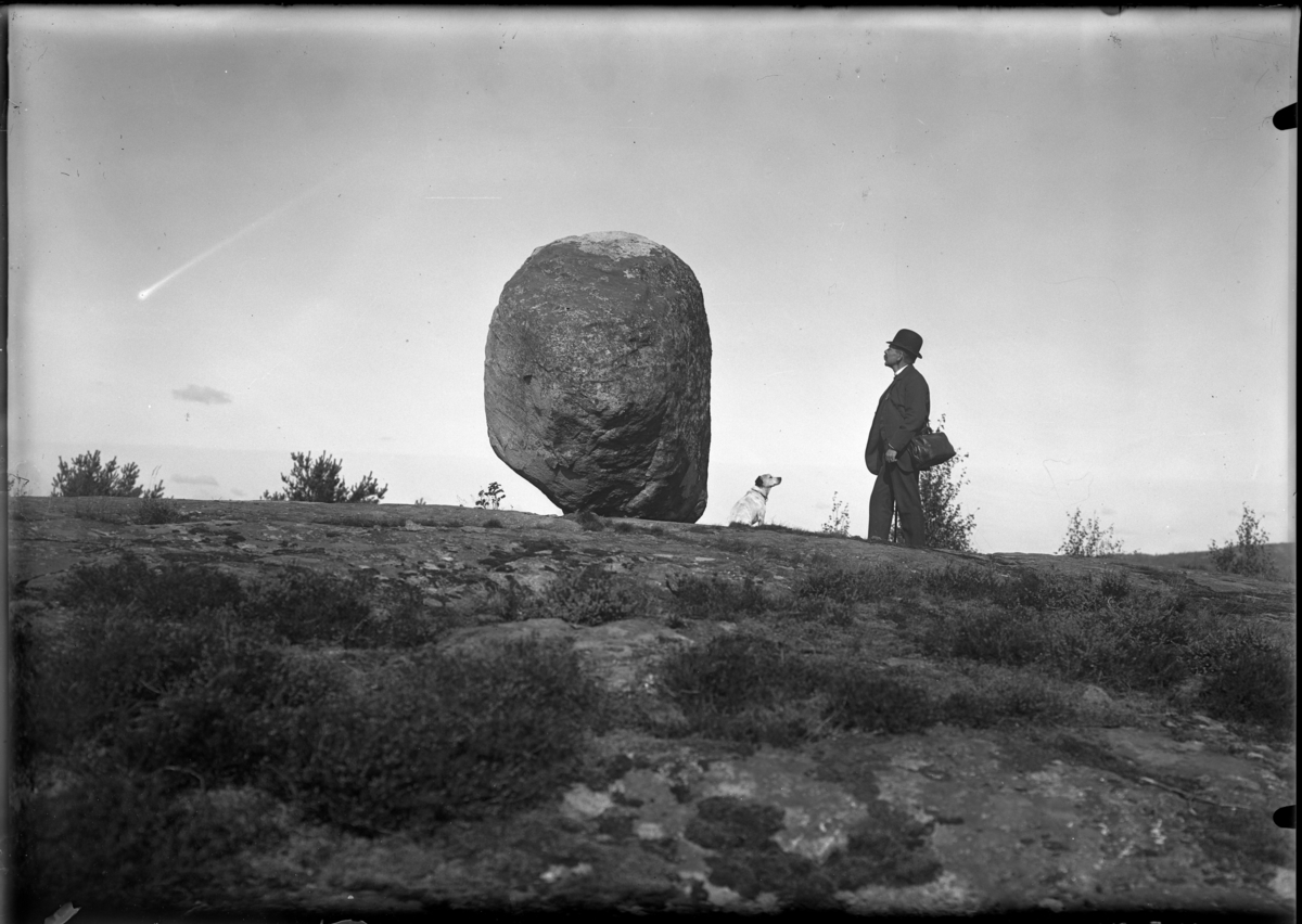 '1 man stående med liten hund framför ett stort flyttblock som står upp på ''kortsidan'', i siluette. På berghäll med viss ljungvegetation.'
