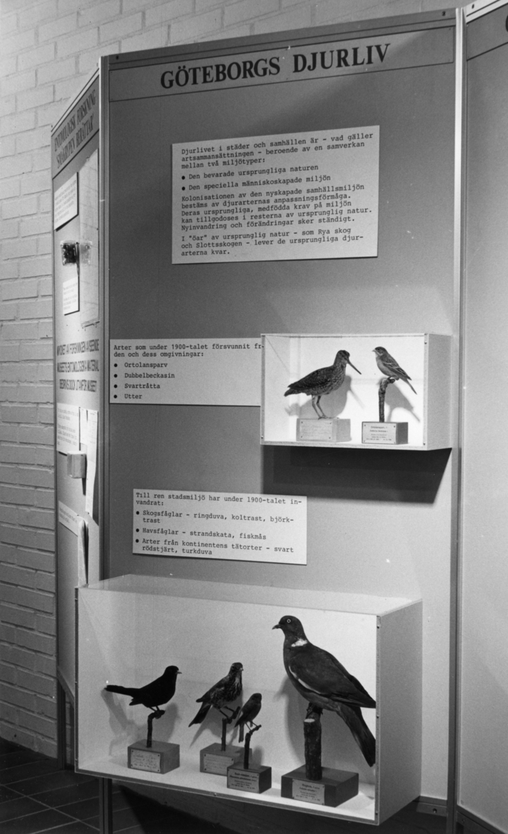 'Foto på Jubileumsutställningen, Göteborgs Naturhistoriska museum 150 år. :: :: Utställningsskärm angående Göteborgs djurliv. Med fågelexempel: Dubbelbeckasin (Lignells saml.), Ortolansparv (Av.su. 5186), Koltrast (Lignells saml.), Björktrast (Lignells saml.), svart rödstjärt (Av.su. 5147), Ringduva (Av.su. 4682).'