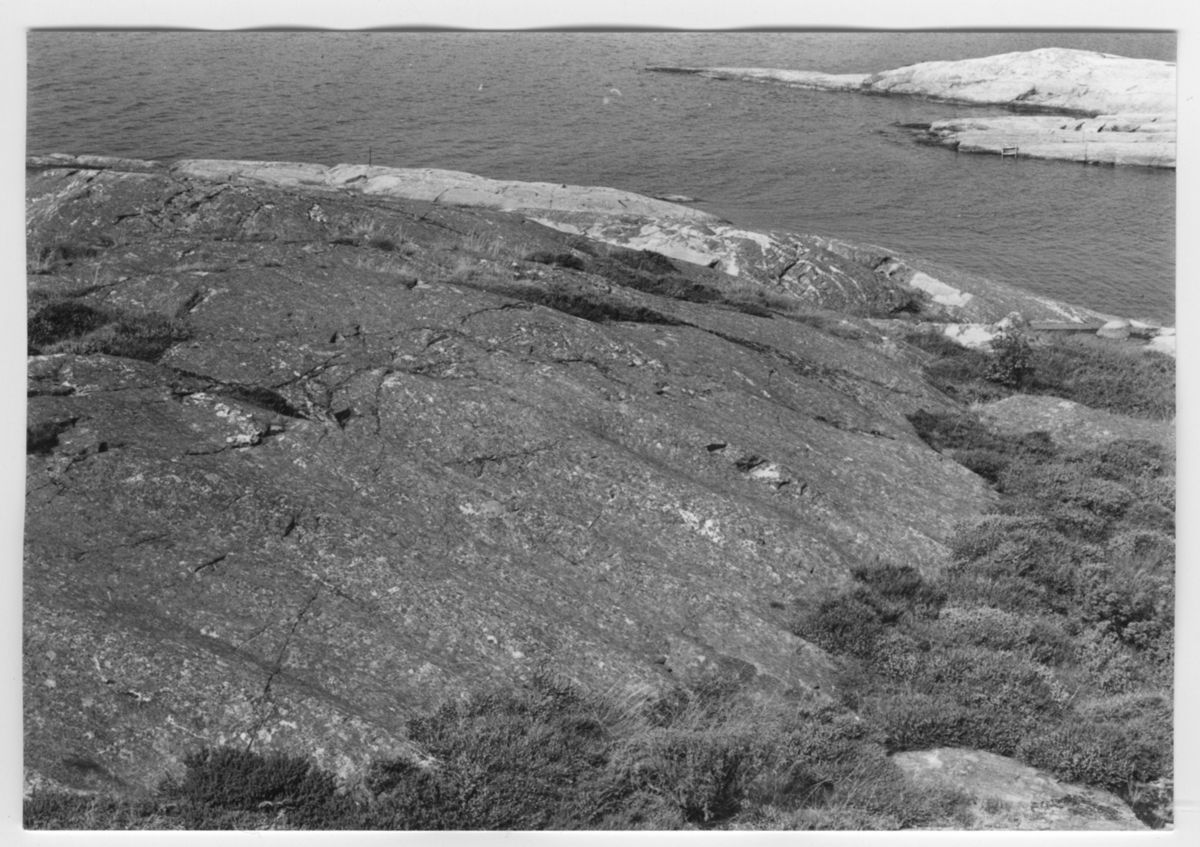 'Bildtext: ''Häll med isräfflor.'' Närbild på berghäll med isräfflorna, vy ut mot havet. :: :: Ingår i serie med fotonr. 6970:1-1125, dokumentation av Hisingens naturgeografi, visande landskapsformerna i stora drag och gjord inför exploateringen av området. Platserna för fotograferingen finns utsatta på karta i skala 1:4000 som finns på Göteborgs Naturhistoriska musem. Fotoriktningen mättes med kompass i gammalgrader.'