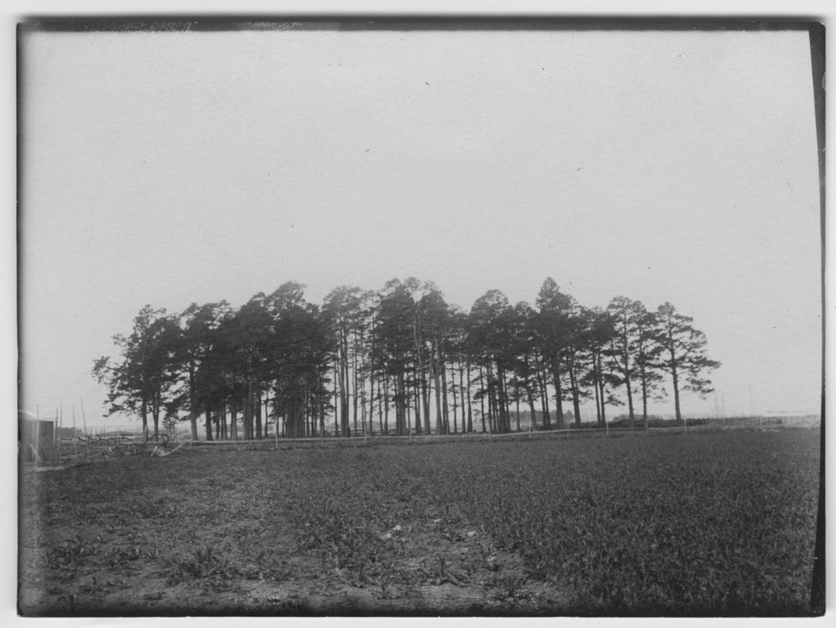 'Vy med råkkoloni i liten skogsdunge, tallar. Enligt bildtext: ''En råka i större tallen från höger.'' I förgrunden öppet fält, åker. :: :: Se även fotonr. 675.'