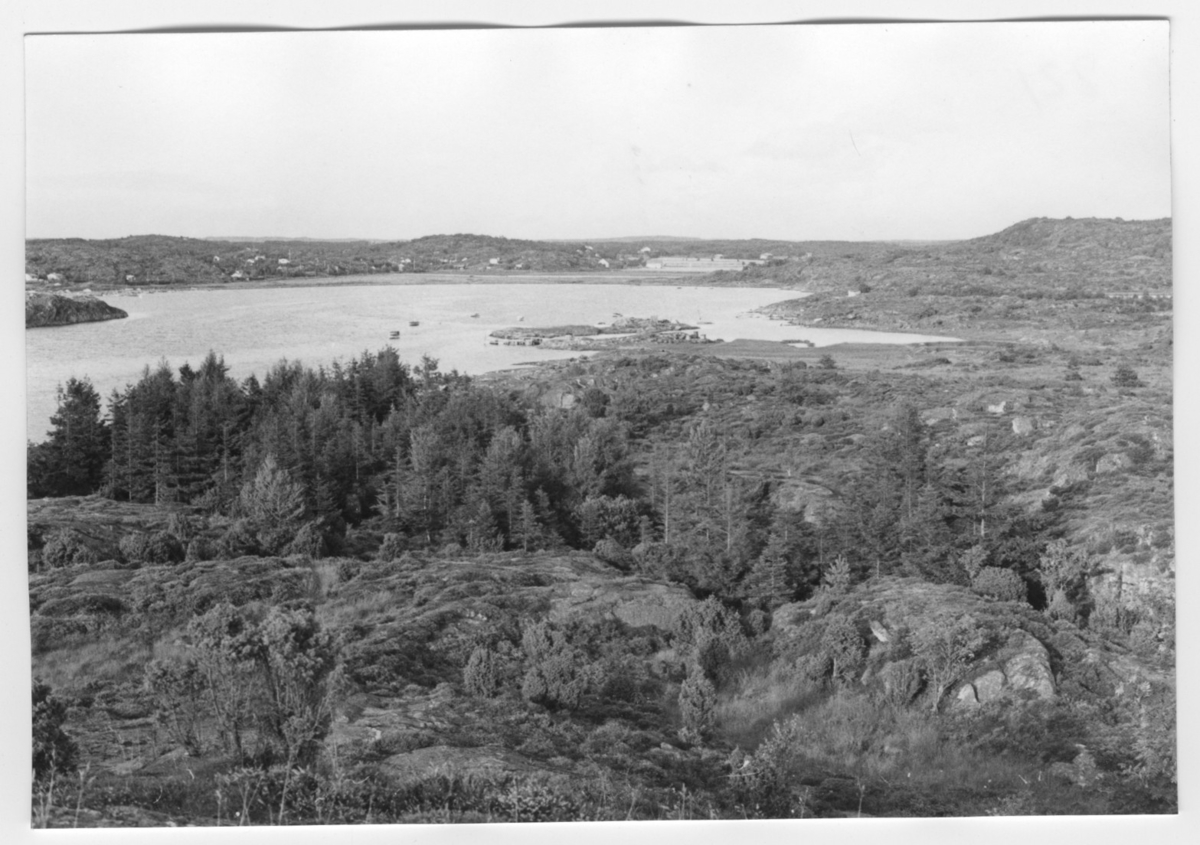 'Bildtext: ''Vik med strandäng. Hällar hitom. Riktning 60.'' :: Vy över havsviken med strandäng innanför. I förgrunden berghäll med enbuskar och ljung, i de lägre partiet barrträd, gran. :: :: :: Ingår i serie med fotonr. 6970:1-1125, dokumentation av Hisingens naturgeografi, visande landskapsformerna i stora drag och gjord inför exploateringen av området. Platserna för fotograferingen finns utsatta på karta i skala 1:4000 som finns på Göteborgs Naturhistoriska musem. Fotoriktningen mättes med kompass i gammalgrader.'