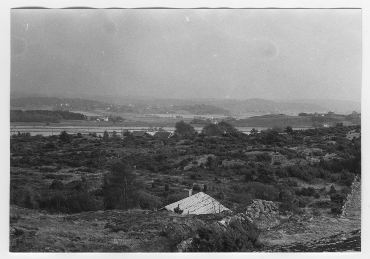 'Bildtext: ''Sedimentdalgång. Riktning 94.'' I förgrunden berghäll med stenmur. Vy ner över hällandskap med enbuskar och ljung och hustak synliga. Vy med i fonden hus. Stengärdesgård. :: :: Ingår i serie med fotonr. 6970:1-1125, dokumentation av Hisingens naturgeografi, visande landskapsformerna i stora drag och gjord inför exploateringen av området. Platserna för fotograferingen finns utsatta på karta i skala 1:4000 som finns på Göteborgs Naturhistoriska musem. Fotoriktningen mättes med kompass i gammalgrader.'