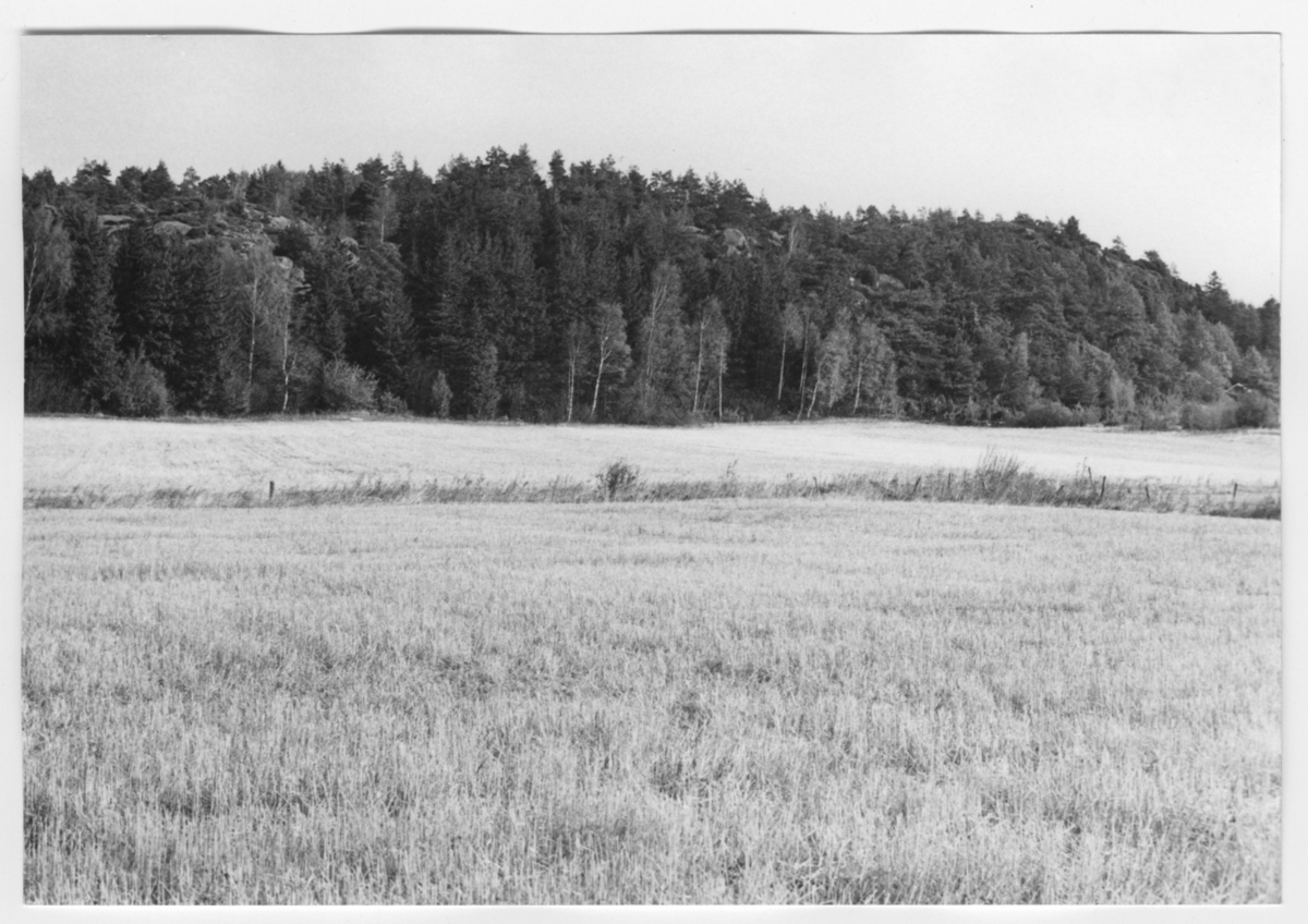'Bildtext: ''Sedimentyta. Riktning 44.'' Vy över öppna fält (vall) avdelade med staket och i fonden berghäll med bevuxen av lövträd och gran. :: :: Ingår i serie med fotonr. 6970:1-1125, dokumentation av Hisingens naturgeografi, visande landskapsformerna i stora drag och gjord inför exploateringen av området. Platserna för fotograferingen finns utsatta på karta i skala 1:4000 som finns på Göteborgs Naturhistoriska musem. Fotoriktningen mättes med kompass i gammalgrader.'