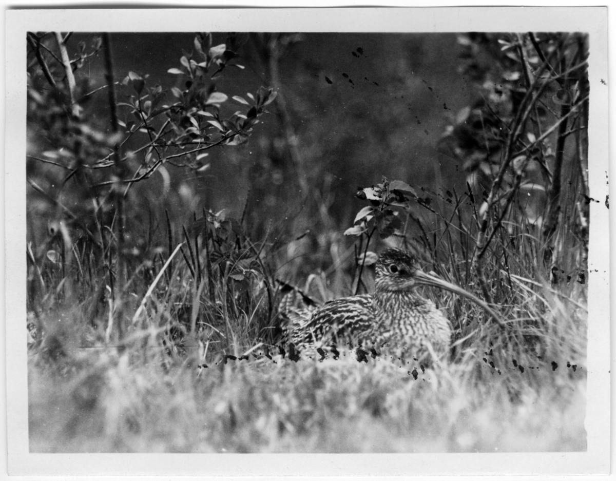 'Storspov liggande på redet i högt gräs vid buskar. :: Text till fotot: ''Storspov på myren vid Sörnypan?''. :: :: Ingår i fotonr. 6995:1-51, dessa sitter i ett fotoalbum med tillhörande beskrivningar på norska.'