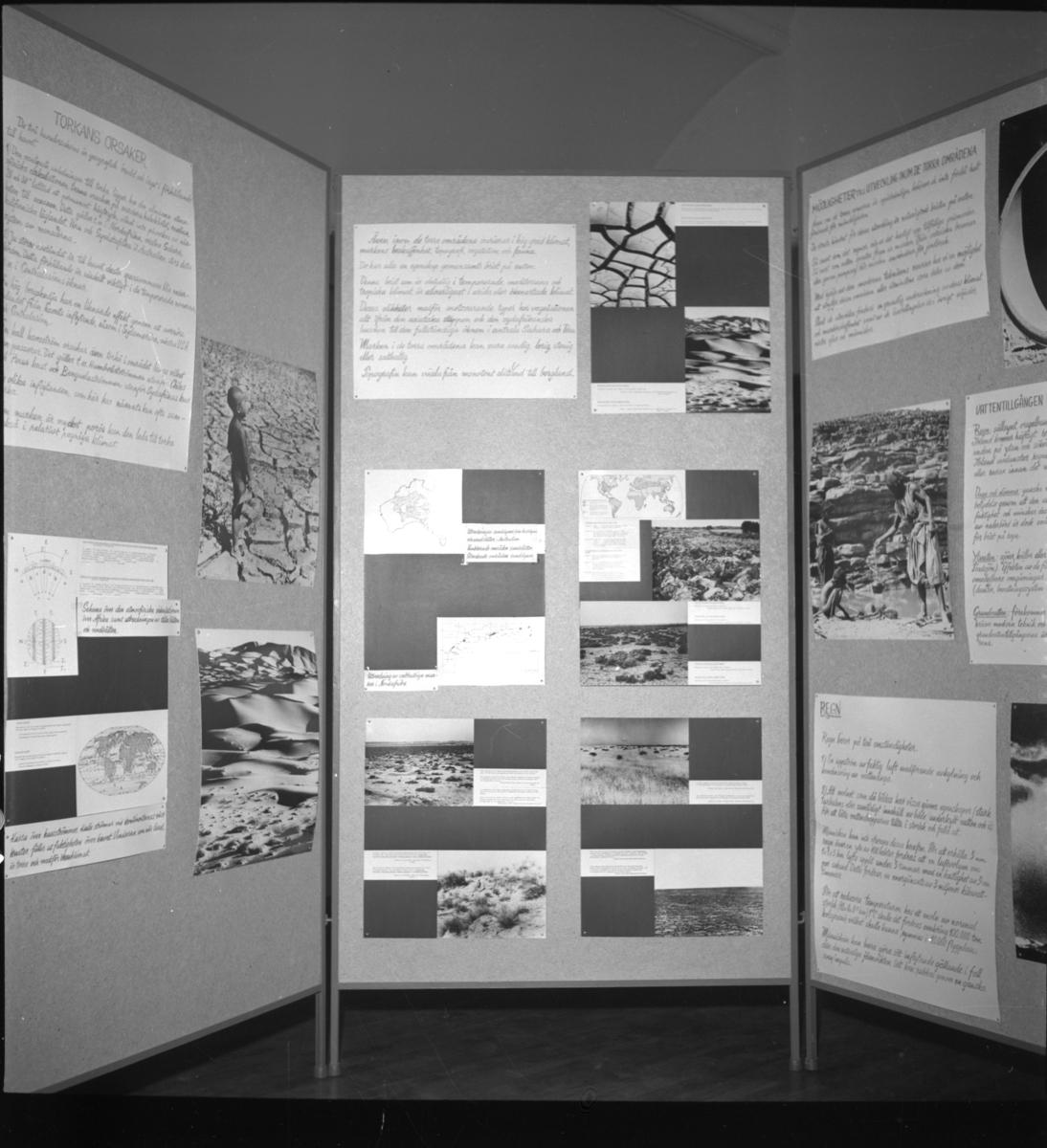 'Uställningen ''Människan och öknen - en utställning presenterad av UNESCO''. :: :: Utställningsskärm med texter och bilder med bl. a. titel ''Torkans orsaker''. :: Ingår i serie med fotonr. 6984:1-18.'