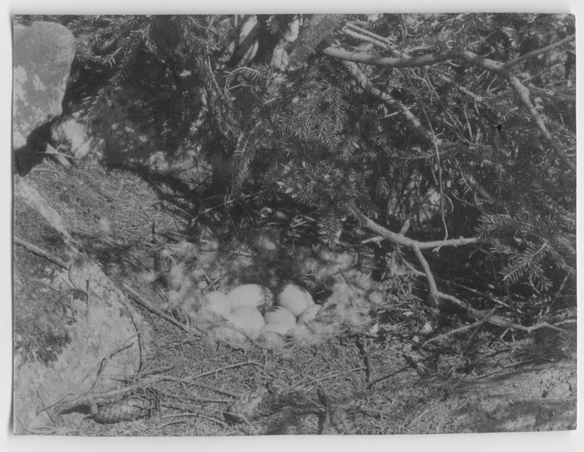 'Småskrake, bo med 8 ägg. Under gran intill berghäll. :: :: Se serie med fotonr. 795-815.'