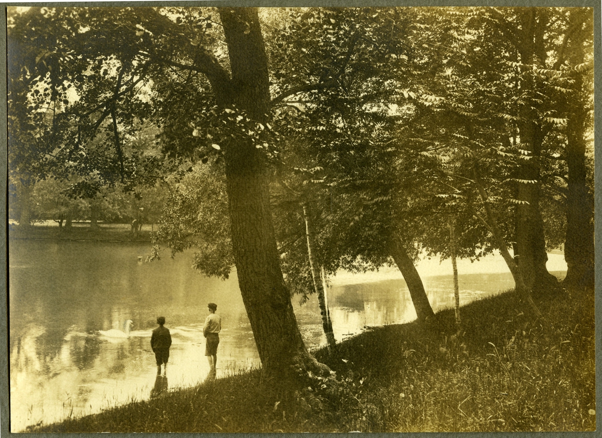 'Bildtext: ''Parti från Lilla Dammen. '' :: Vy med 2 barn, pojkar, stående en bit ut i vattnet nära en svan. Kläder. :: :: Ingår i serie med fotonr. 7092:1-2.'