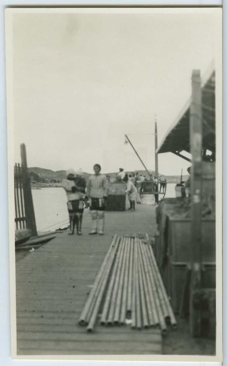 'Lossning av fartyget ''Hans Egedr''. På bilden syns inuiter (eskimåer) (enligt Frits Johnsons dagbok), en man och en kvinna med ett barn i famnen, stående på brygga. I bakgrunden syns fler personer som håller på med lossningsarbetet. Kläder. Klädsel. :: :: Ingår i serie Fotonr. 5217:1-103. Se även hela fotonr. 5202-5218 med bilder från Frits Johansen.'