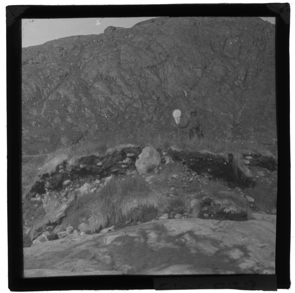 '1 person med håv stående på gräsbevuxen yta med bergvägg i bakgrunden. :: :: Ingår i serie med fotonr. 5213:1-7, se även fotonr. 5217:1-98. Se även hela fotonr. 5202-5218 med bilder från Frits Johansen.'