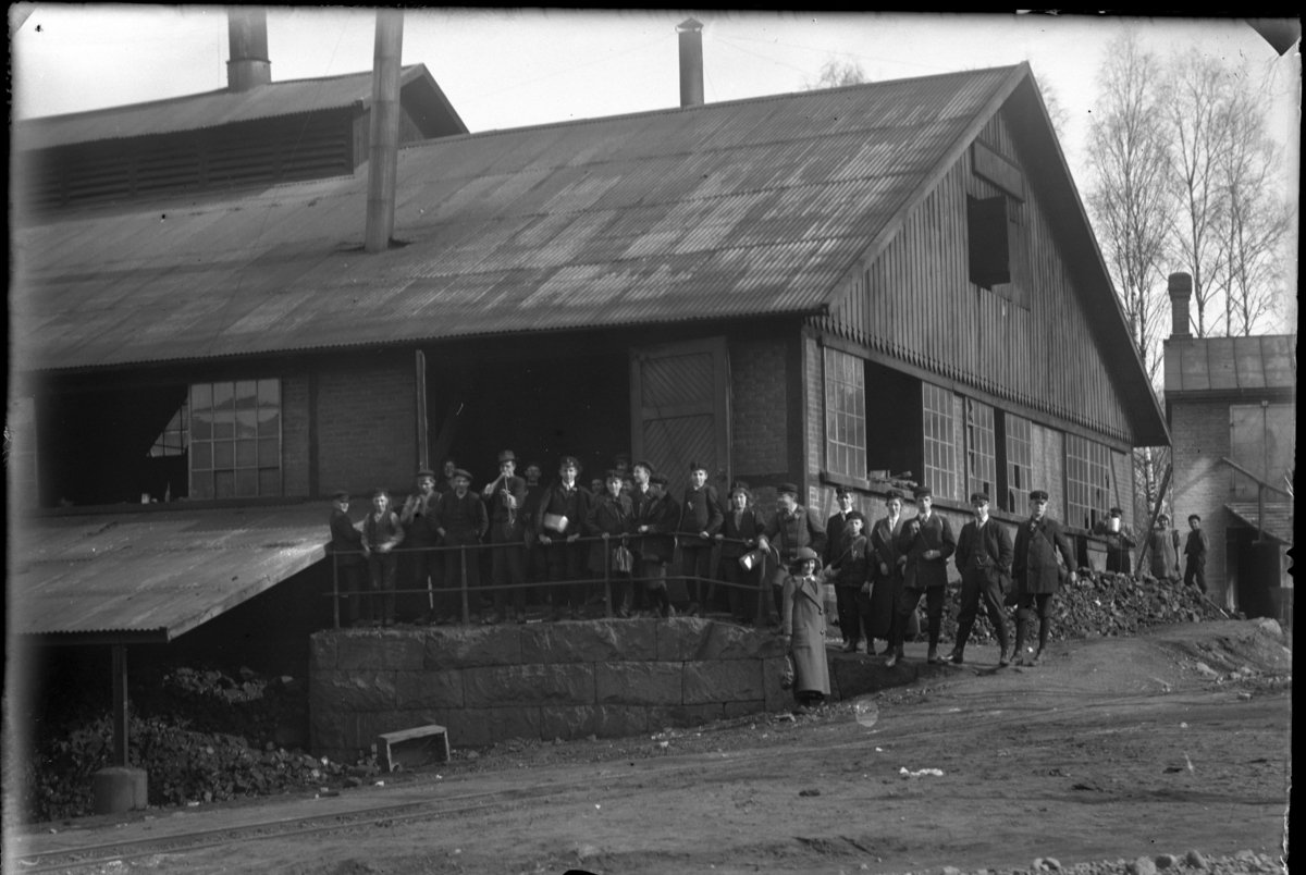 'Gruppbild. 24 personer, varav 2 kvinnor, samlade framför gårdsbyggnad, ekonomibyggnad i tegel och trä. I bakgrunden ytterligare 3 personer, 2 pojkar och 1 flicka varav den ena pojken håller upp en hink. Skjulutbyggnad till byggnaden. :: :: Ingår i serie med fotonr. 5140:1-39.'