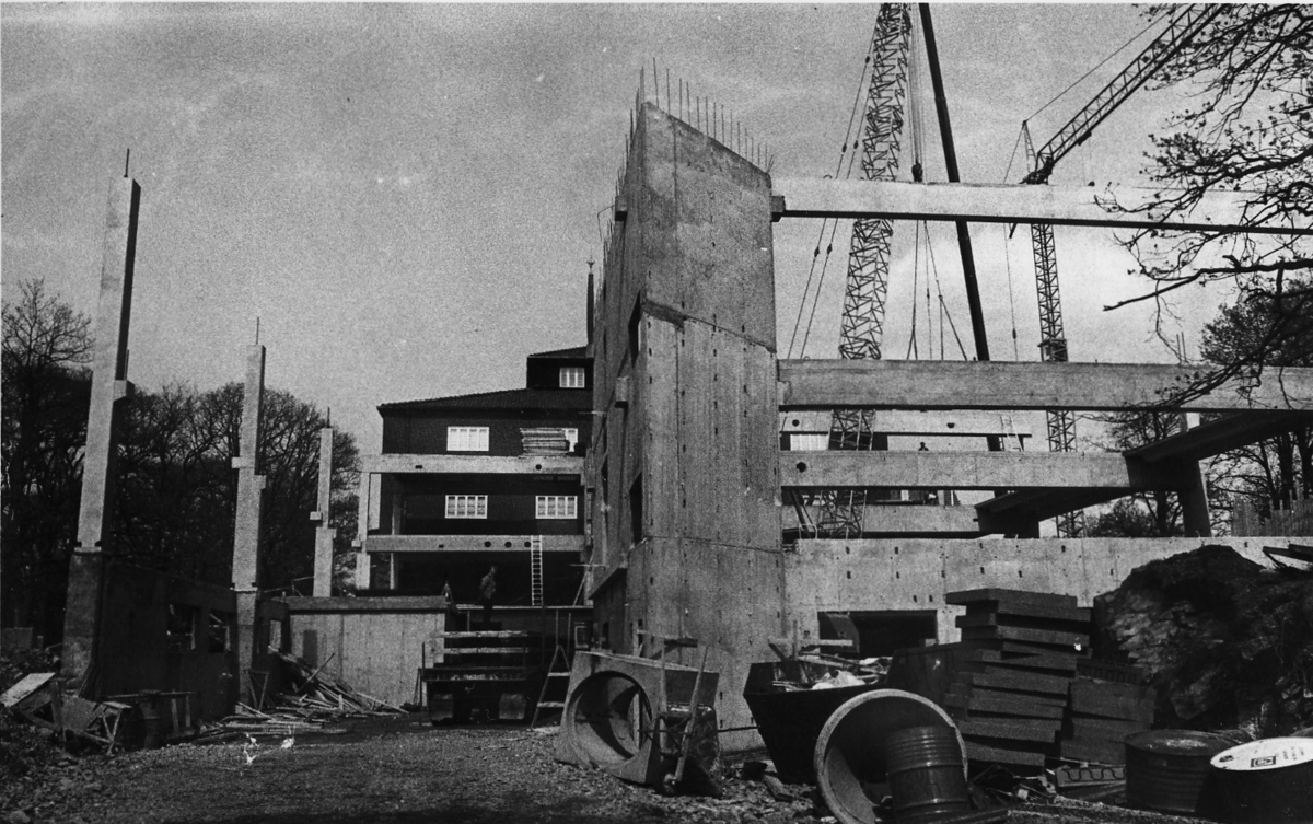 'Tillbyggnaden av Göteborgs Naturhistoriska Museum juni 1979. Göteborgs Naturhistoriska Museum södra sidan, grundkonstruktion uppsatta, betongbalkar. :: :: Ingår i serie med fotonr. 5527:69-216.'