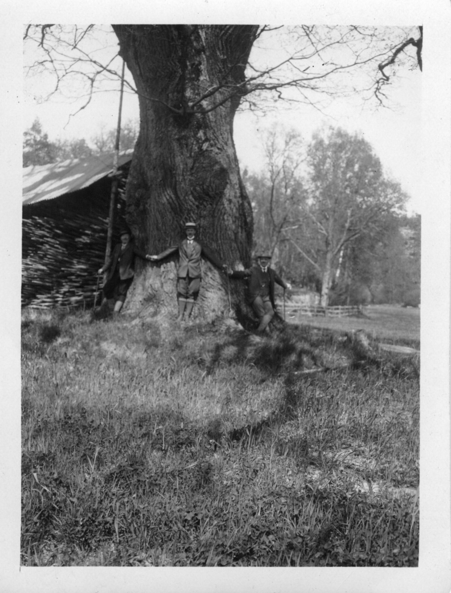 'Text på baksidan av fotot: ''Fridlyst ek å Aspenäs (vid sjön Aspen). (Genomskärning ca 3 m, höjd 25-27m). :: :: 3 män stående framför eken, med armarna utsträckta kring stammen. I bakgrunden byggnad och hägnad. :: :: Ingår i serie med fotonr. 895:1-4.'