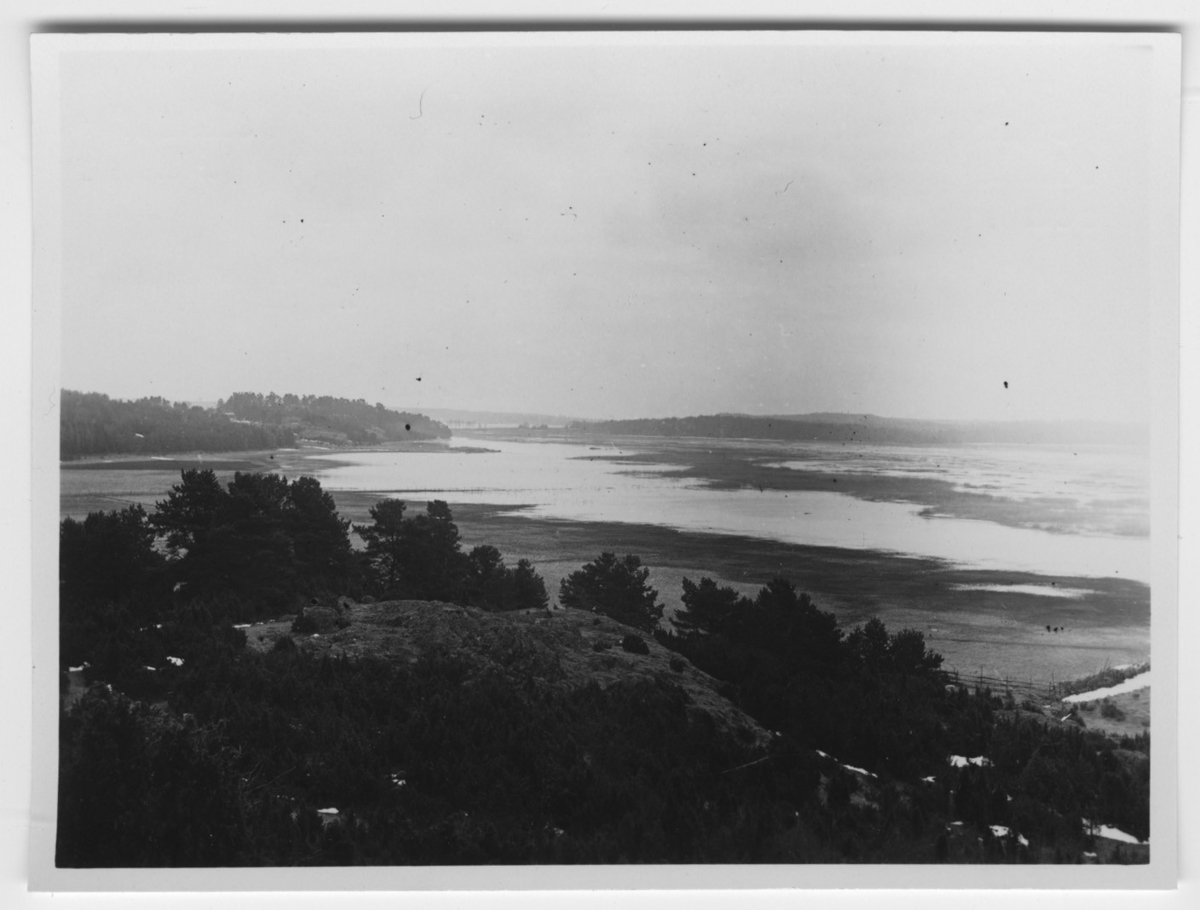 'Utsikt över sjön från norr, vy med vass i sjön. Vyn tagen uppifrån berghäll bevucen med tall och en. :: Text på baksidan:''Utsikt från sjön från norr. Snö och is finns ännu kvar. Observera vattenståndet och jämför med nästföljande bild.'' :: :: Ingår i serie med fotonr. 2305-2346.'