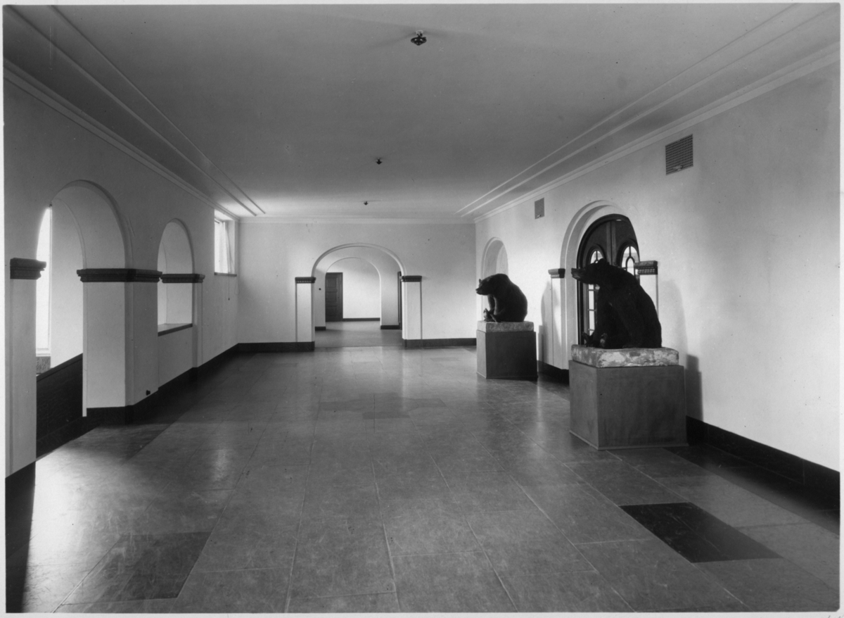 'Vy över 2:a våningens vestibul. Till höger ingången till däggdjurssalen med 2 monterade svartbjörnar på vardera sida. :: Svartbjörn till vänster om ingången: Ma.ex. 710. Gen.kat.nr. 1907-1291. Fynddatum: 1907-00-00. :: :: Svartbjörn till höger om ingången: Ma.ex. 709. Fynddatum: 1907-00-00. Gen.kat.nr. 1907-1290. Monterad av J. Mäntynen. :: :: Ingår i serie med fotonr. 2735-2769.'