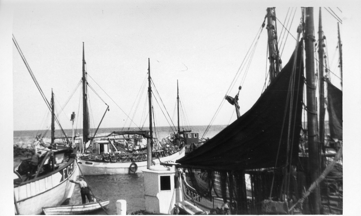 'Akka-expeditionen sommaren 1932: :: :: Hummertinelastad båt i hamnen intill båten ''Skandia'' (FC51) till vänster. :: :: Ingår i serie med fotonr. 2400-2453.'