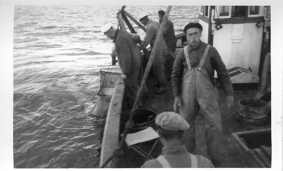 'Akka-expeditionen sommaren 1932: :: :: 6 st män på Skandias däck, i färd med att sätta ut Scherbrutzennätet. :: :: Ingår i serie med fotonr. 2400-2453.'