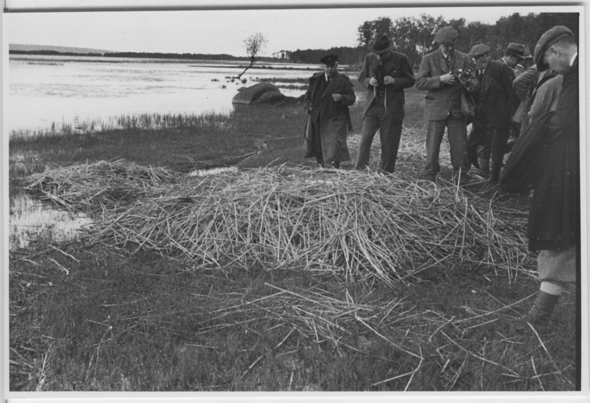 'Biologiska föreningens utfärd till Tåkern, Vadstena m.fl. platser: :: :: Ca 10 män runt 1 svanbo, vy över sjön Tåkern intill. :: :: Se fotonr. 3588-3634 samt 3661-3677.'