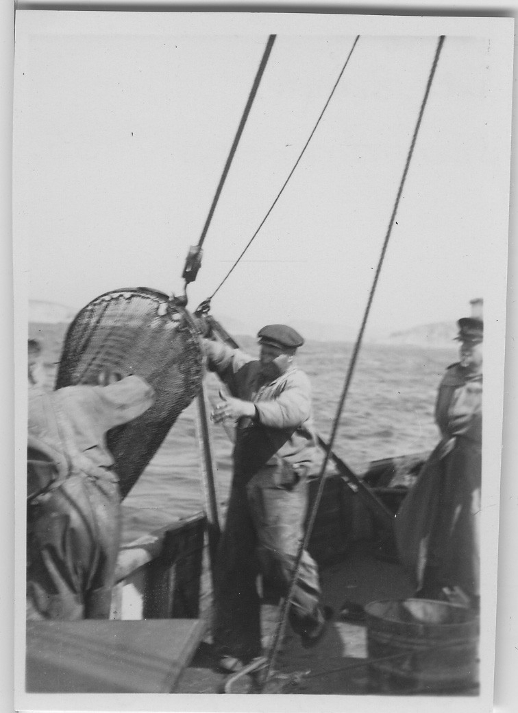 'Naturhistoriska museets Skandiaexpedition 1935: :: :: Trålen? tas upp, 3 män på båtdäck. Ev Leonard Axel Jägerskiöld längst till höger. :: :: Ingår i serie med fotonr. 3487-3494. Se även fotonr. 3482-3486. Se även fotonr. 3441:1-14.'