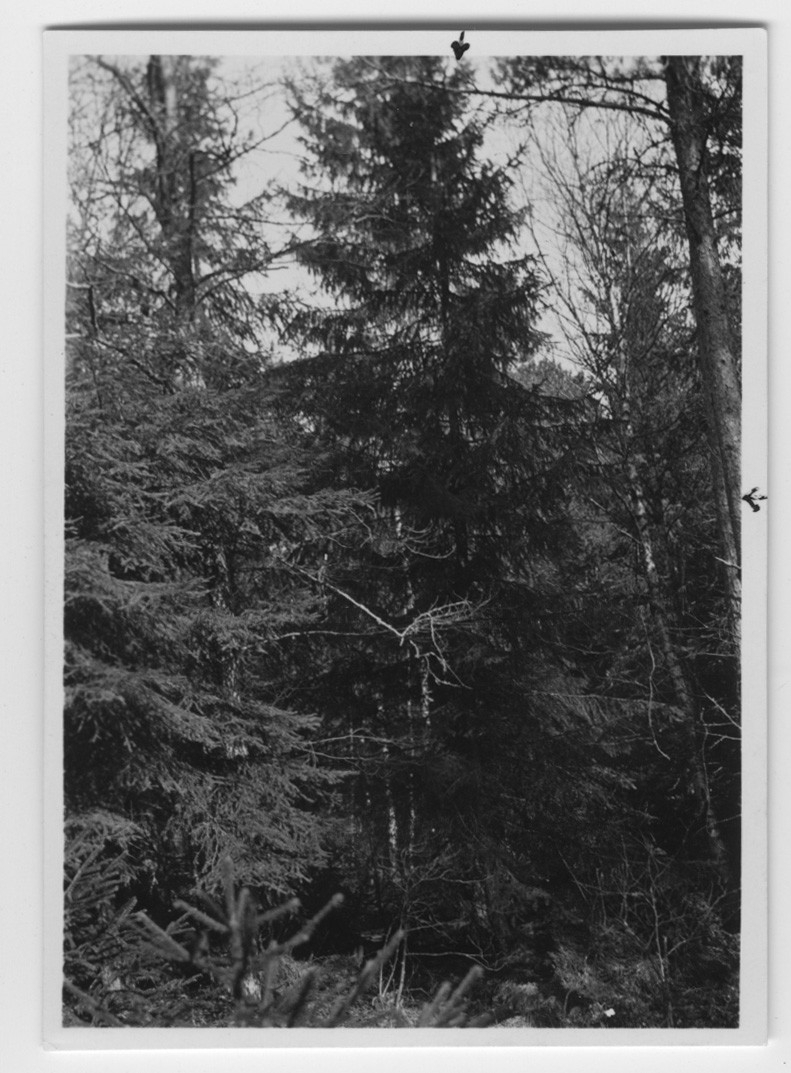 'Nötkråkans häckningsterräng, granskog, vy med boträdet, gran. :: :: Ingår i serie med fotonr. 3646-3649.'