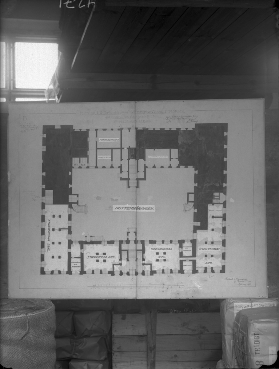 'Ritningar till nytt Naturhistoriskt Museum. Ritningarna avfotograferade mot vägg. (1893). :: :: ''Ritning till förändring af Göteborgs Musei byggnad f.d. Ostindiska Kompaniets Hus.'' Ritning inför förändring av Göteborgs Museums byggnad (före detta Ostindiska Kompaniets hus). Bottenvåningen. :: :: Ingår i serie med fotonr. 4271:1-24.'