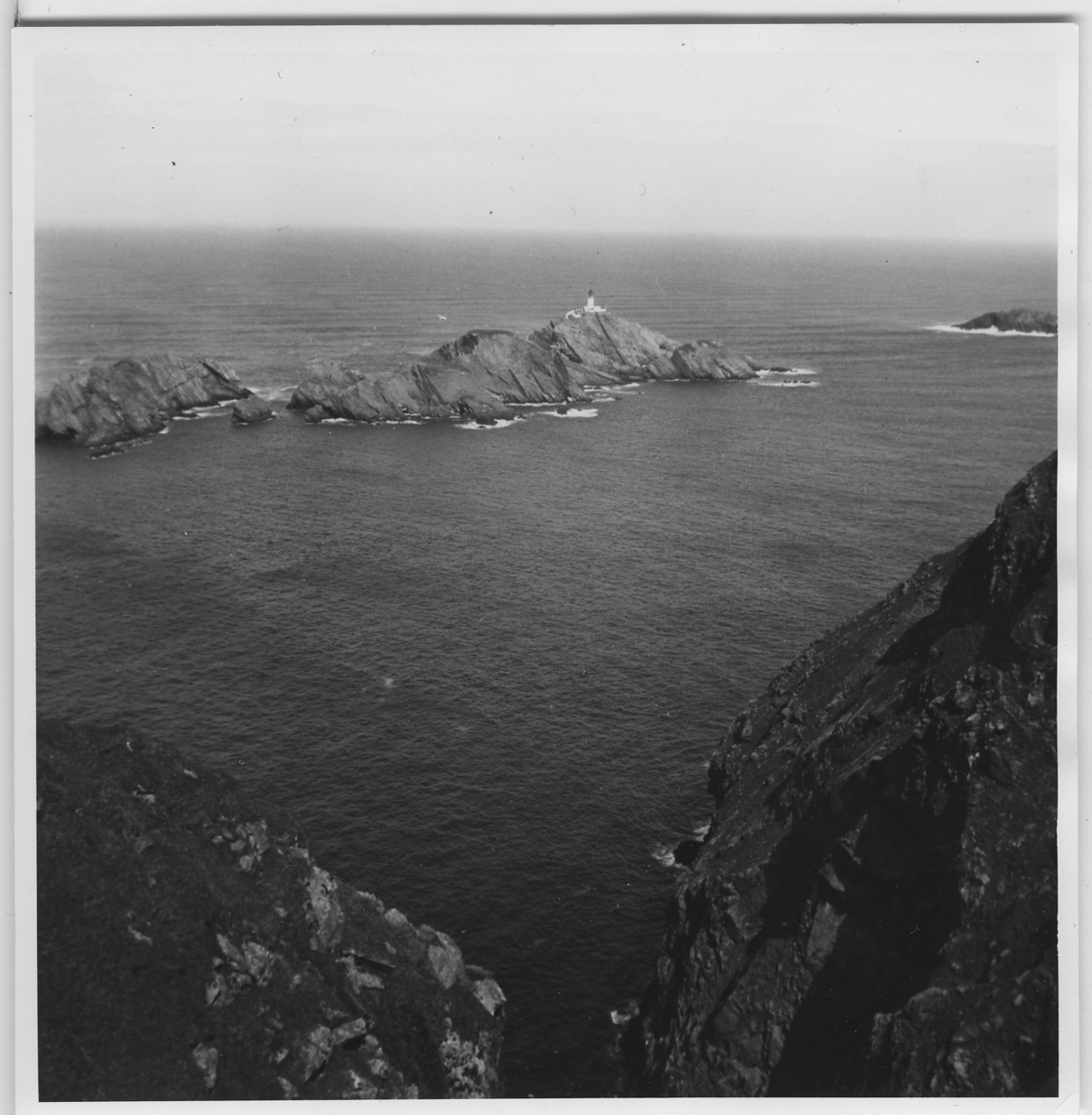 'Från ''Skageraks''-expeditionen till Hebriderna och Shetland: :: :: Vy över Muckle Flugga, den nordligaste klippan bland de brittiska öarna. Synlig är fyren som stod klar 1854 (förstorad version av foto nr 4113:79) :: :: Ingår i serie med fotonr. 4113:1-82.'