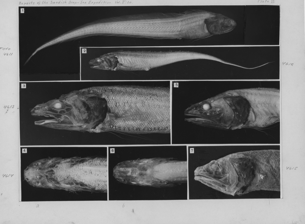 'Nr 2) 1 st Porogadus abyssalis sedd från sidan. :: :: Ingår i serie med fotonr. 4611-4615, ur O. Nybelin: Deep-Sea Bottom-Fishes. Plate VI, fig. 2. Reports of the swedish deep-sea expedition Volym 2 häfte 20. :: :: Stämpel på baksidan: ''Elanders boktryckeri aktiebolag, Douglas Elander''.'