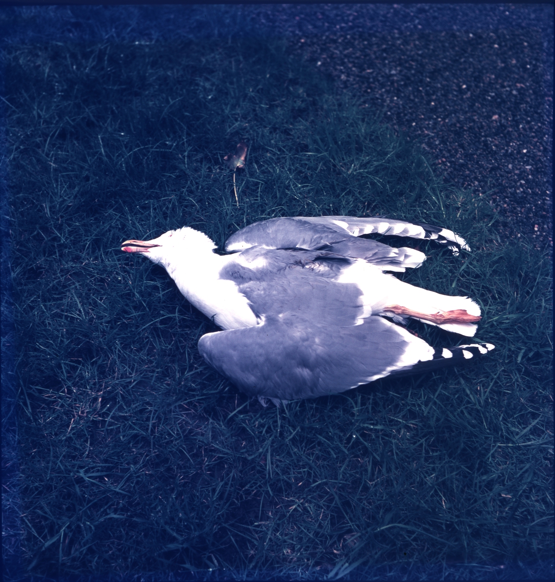'Gulfotad gråtrut, död. Fågel liggande på gräsmatta. Ryggsidan sedd snett från sidan. Inkom 1957-04-30. :: :: Ingår i serie med fotonr. 4679.'