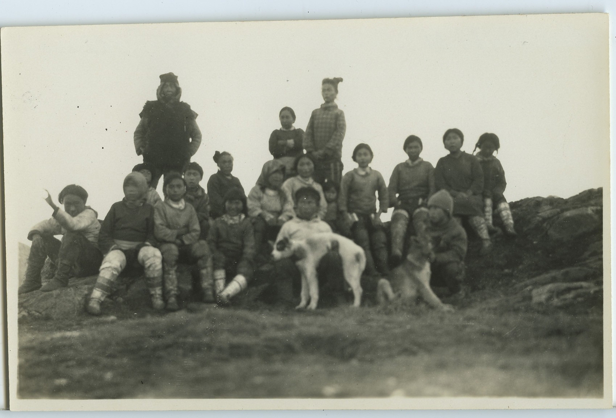 '19 st inuiter (eskimåer), kvinnor, män, barn, flickor, pojkar och 2 hundar samlade för fotografering på en bergshäll. Östra sidan av Erdkordlek ön. :: :: Ingår i serie Fotonr. 5217:1-103. Se även hela fotonr. 5202-5218 med bilder från Frits Johansen.'