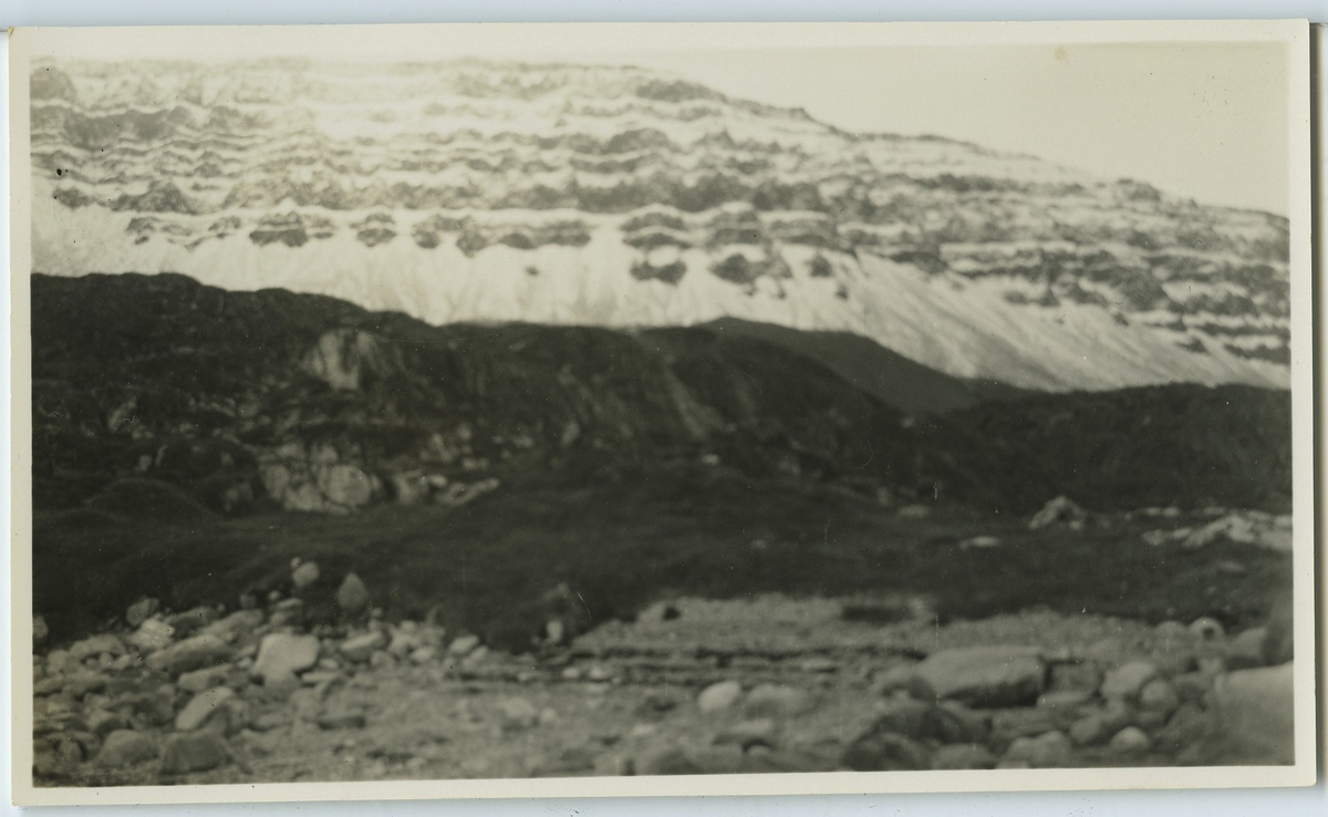 'Safansuk ön, ruin av inuit(eskimå)hus. I bakgrunden snöklätt berg. :: :: Ingår i serie Fotonr. 5217:1-103. Se även hela fotonr. 5202-5218 med bilder från Frits Johansen.'