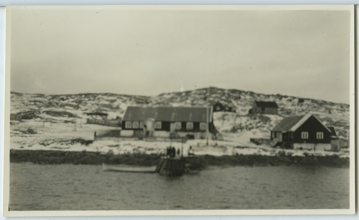 'Vy över hamnen vid Ritenbenk med Mr. Thorsen på trappan, prästens hus m.m., före avresa från Rilenbenk till Jakobshamn med ''Gertrud Rask''. Snöklätt. 4 hus, byggnader, en brygga och en liten båt. :: :: Ingår i serie Fotonr. 5217:1-103. Se även hela fotonr. 5202-5218 med bilder från Frits Johansen.'