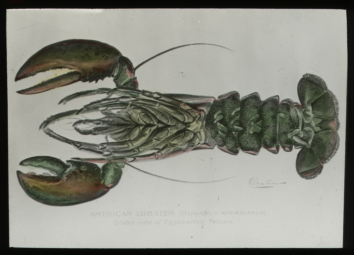 'Amerikansk hummer. Under biilden står: ''Undersidan av äggbärande hona.'' :: Text på på glaset: ''American lobster. Homarus americanus.'' och ''Nature resourses intelligence branch.'' :: :: Ingår i serie med fotonr. 5203:1-22. Se även hela fotonr. 5202-5218 med bilder från Frits Johansen.'