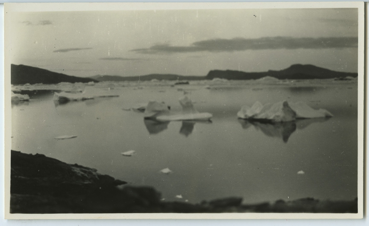 'Erdkordlek ön. Vy över havet med berg i bakgrunden. Uppstickande isflak, isberg. :: :: Ingår i serie Fotonr. 5217:1-103. Se även hela fotonr. 5202-5218 med bilder från Frits Johansen.'