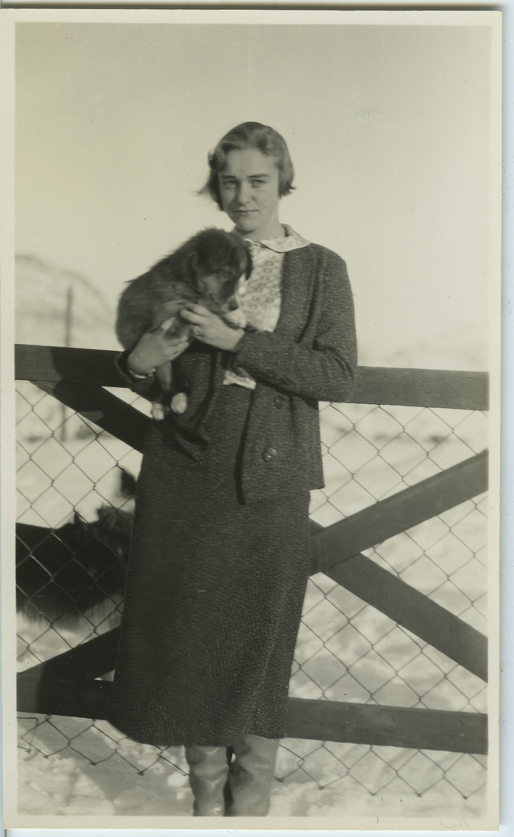 'Kvinna (Mrs Else Waldsoe) med schäfervalp (Patsi) utanför Waldsoes hus, Julianehaab. Klädd i kjoldräkt och blus. Kläder. Klädsel. :: :: Enligt kuvertet som negativet låg i ''Trip to W-Greenland XIII''. :: :: Ingår i serie Fotonr. 5217:1-103. Se även hela fotonr. 5202-5218 med bilder från Frits Johansen.'