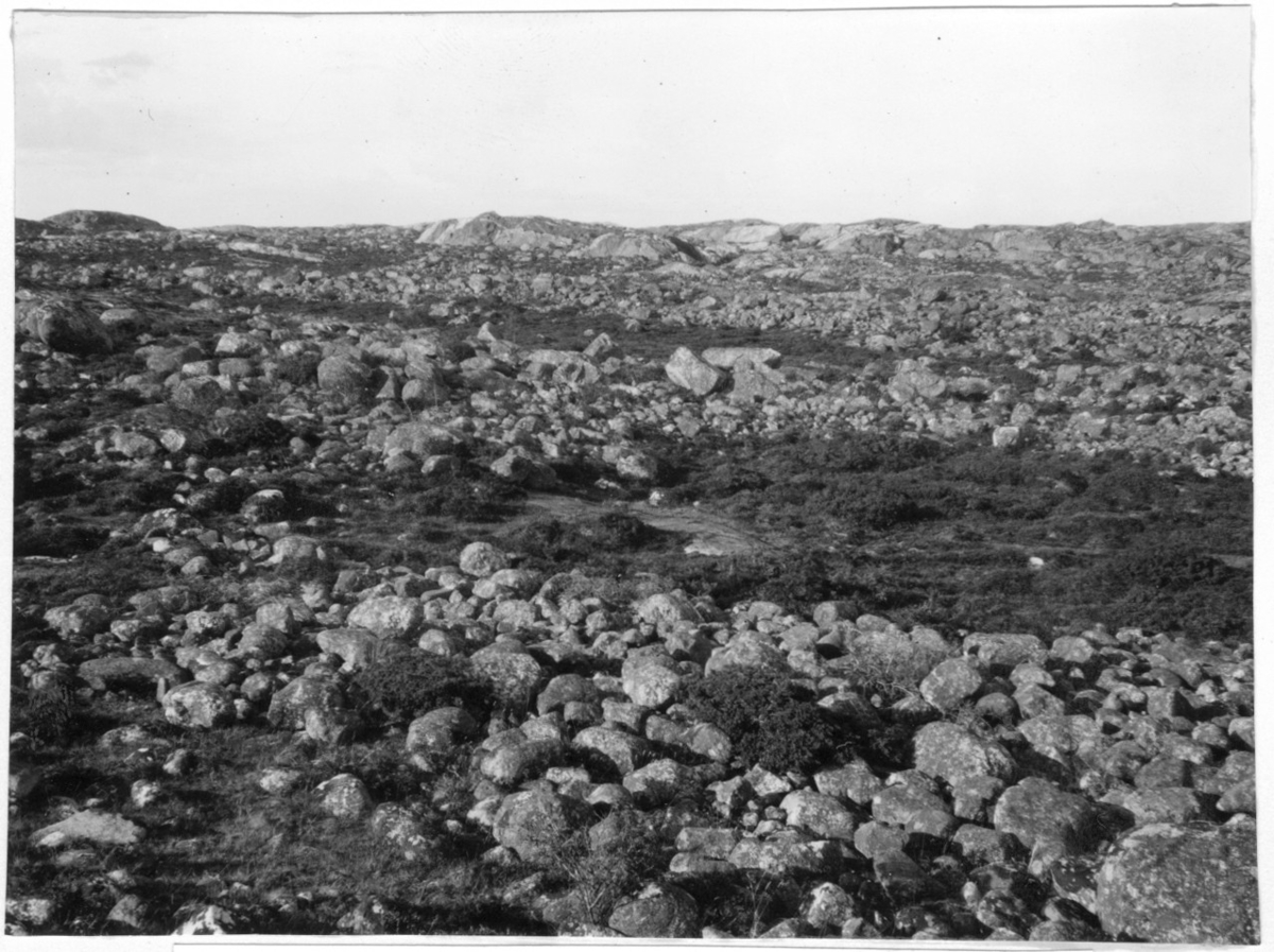'Bildtext: ''Rullstensmark. Sydvästra Sydkoster.'' Vy med öppen mark med berghällar och blockrik mark. :: :: Fotonr. 7046:85-118 indelade som ''Geologiska bilder från Göteborgs- och Bohus län.'' Ingår i serie med fotonr. 7046:1-383, 7047:1-33 och 7048:1-67 med bilder från Länsjägmästare John Lindners bildarkiv.'