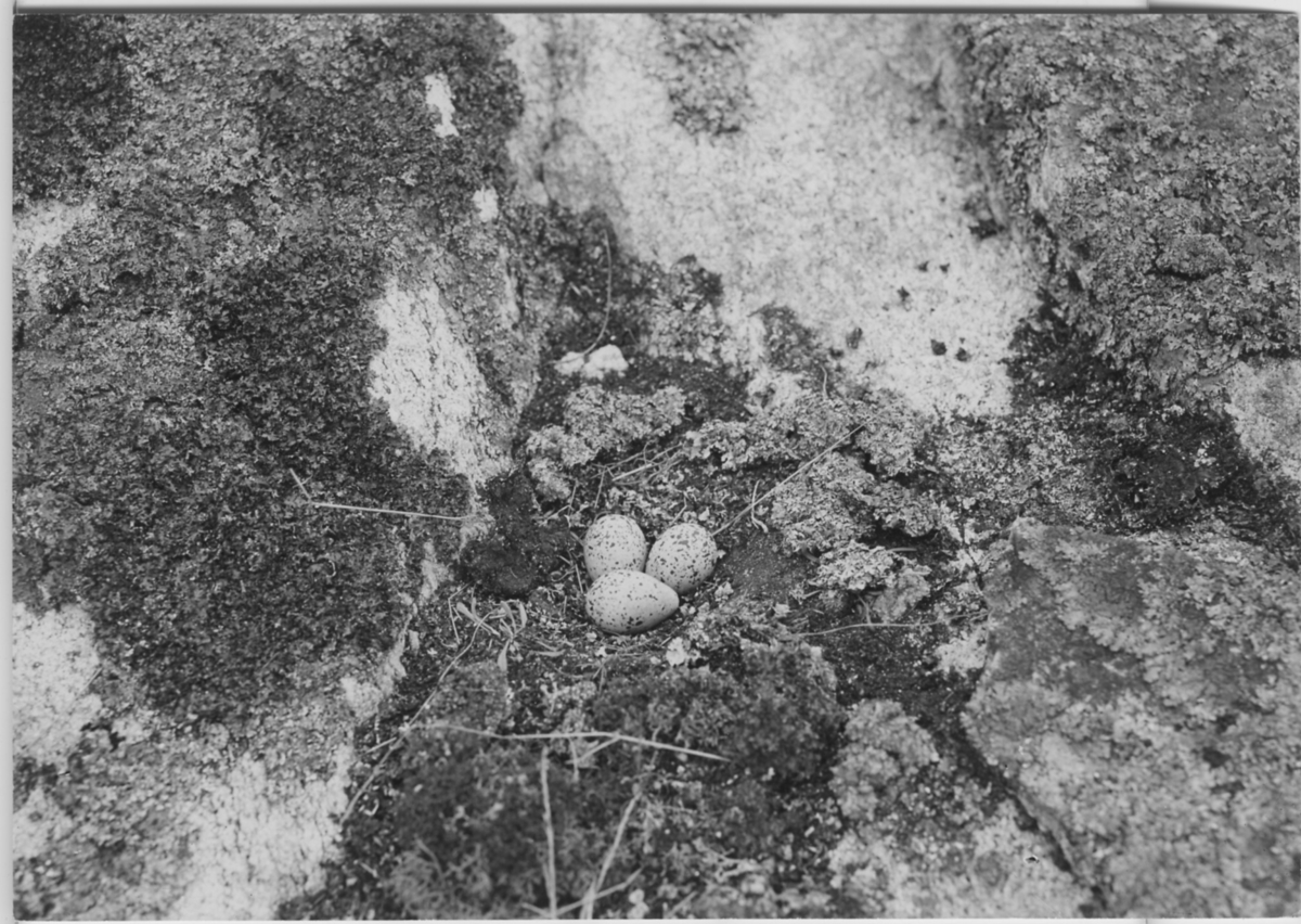 'Bo med 3 st ägg av större strandpipare, bland lavar. :: :: Ingår i serie med fotonr. 128-148.'