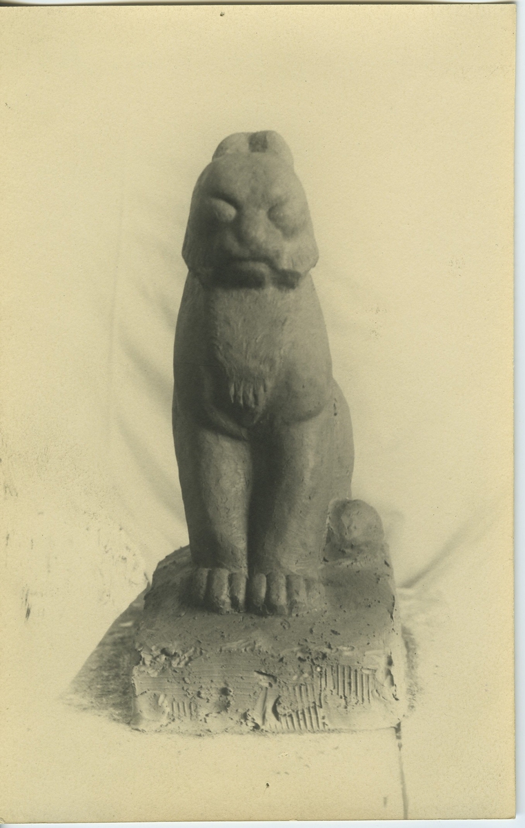 '''Gammal lo'' (lerskiss), utförd avRichard. Mäntynen. Storlek 104 cm höjd och sockel 66 x 44 cm. Huggen i granit 800 kr. Bilden tagen framifrån. :: :: Serie fotonr 972-982 av stiliserade djurskulpturer.'