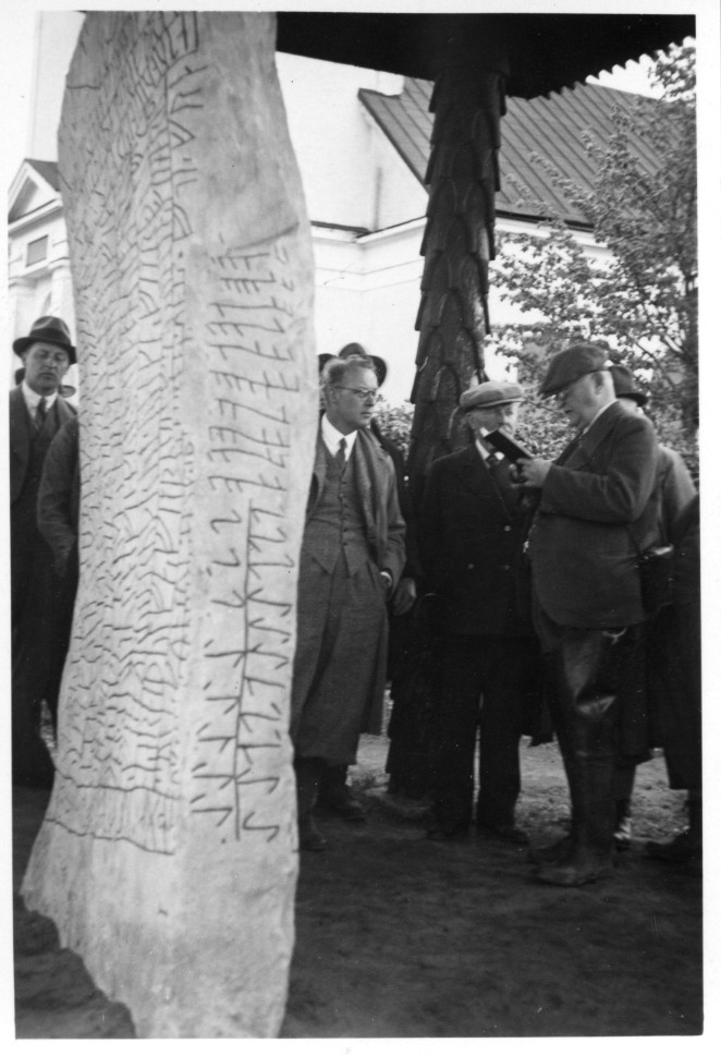 'Biologiska föreningens utfärd till Tåkern, Vadstena m.fl. platser: :: :: Runenstenen ''Rökstenen'', närbild. Knappt 10 män vid stenen. Leonard Axel Jägerskiöld läsande bok el. dylikt. I bakgrunden syns en byggnad. :: :: Se fotonr. 3588-3634 samt 3661-3677.'