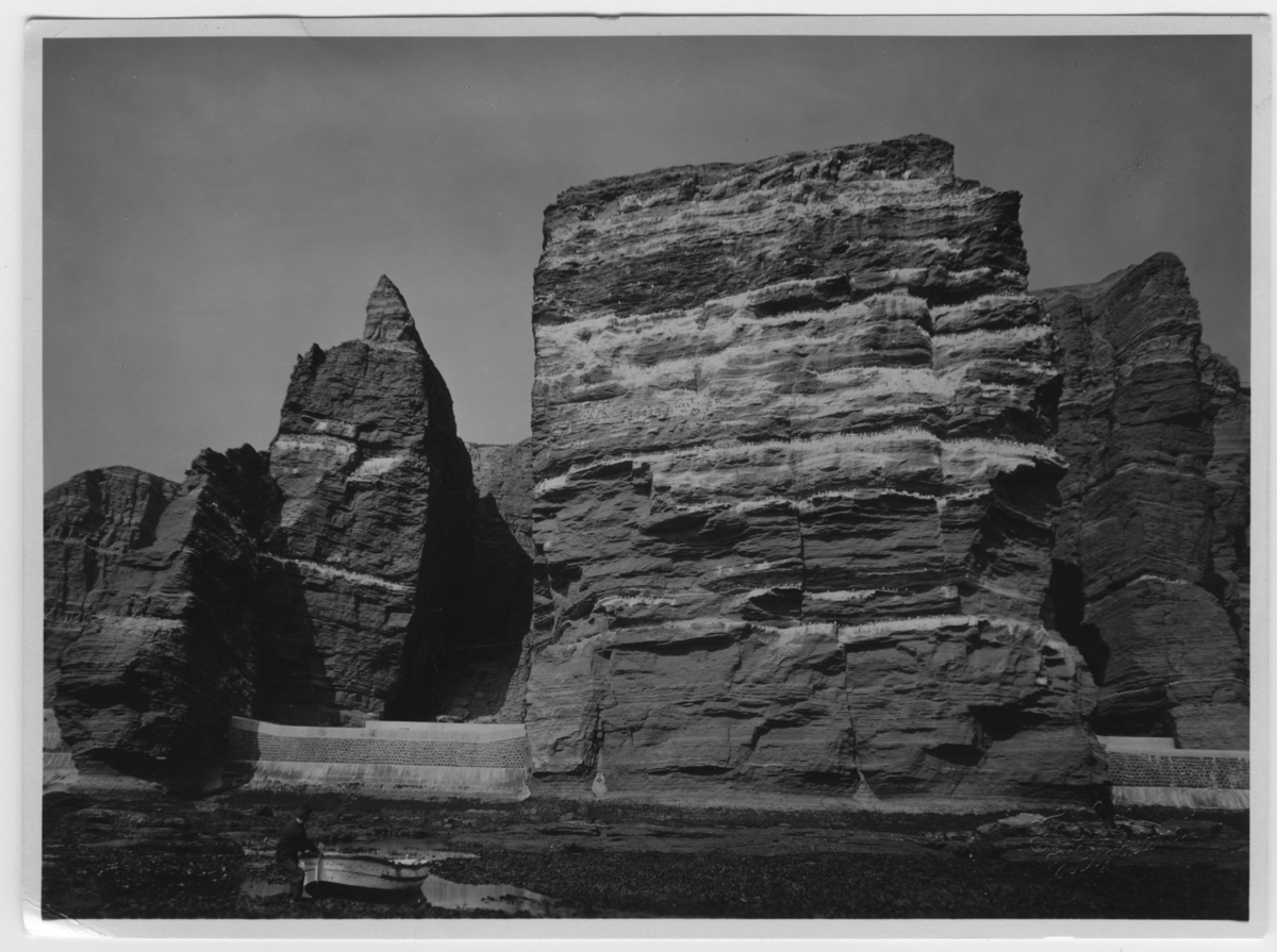'Sillgrisslornas häckningsplats. Stor klippa vid vatten. Murar nedanför klipporna. 1 st person med 1 st liten båt nedanför klippan. :: :: Ingår i serie med fotonr. 2454-2461.'