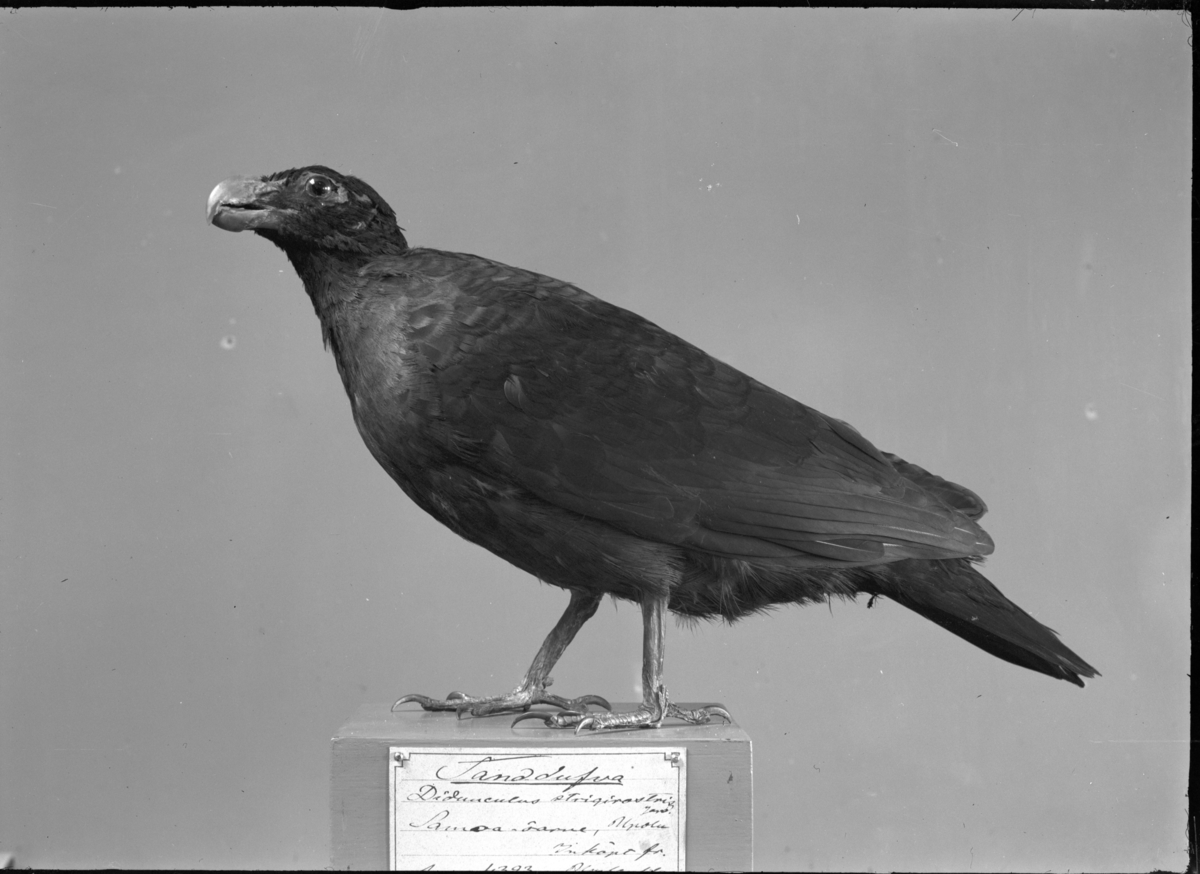 'Tandduva, monterad. Ser ut att står A....? 4393 som Av.ex. eller Av.su. nummer. :: :: På baksidan av papperskopian står: ''Bild X. Tandduva, drontens närmaste nu levande släkting. Göteborgs Naturhistoriska Museum.'''