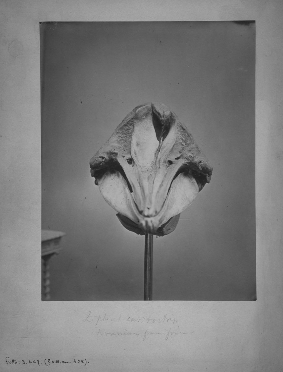 'Småhuvudval. Skalle sedd framifrån. Fynddatum: 1867-04-22. :: :: Ingår i serie med fotonr. 3226-3228.'