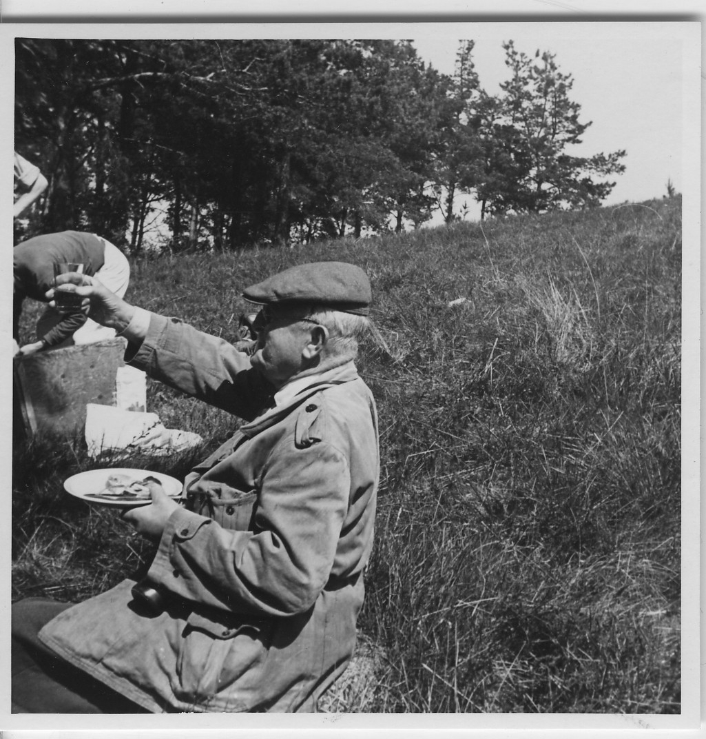 'Biologiska Föreningens utfärd till Oset och Kvismaren. :: :: Leonard Axel Jägerskiöld (lyfter sitt glas) m.fl. sittandes på en gräsluttning med glas och tallrik i händerna. Fotograferad från sidan från nära avstånd. Kläder. Klädsel. :: :: Ingår i serie med fotonr. 4386:1-18.'