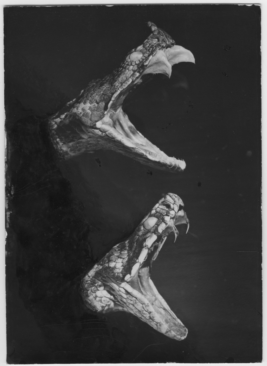 '2 st ormhuvud med öppna käkar, sandviperan (sandhuggorm) resp. huggorm. Öppna gap med gifttänderna samt fångtänder synliga. (Dubbel storlek mot verkligheten) :: :: Ingår i serie med fotonr. 4501:1-60 ur ingenjör Otto Cyréns ''Ormar i fantasi och verklighet''. Bilden med på s. 45 i verket.'