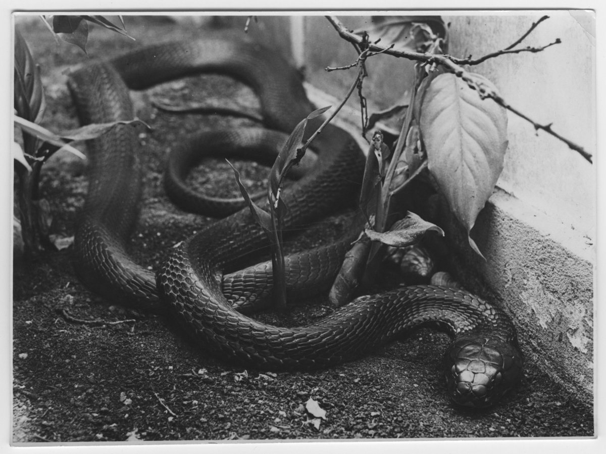 '1 kungsboa, ringlande på marken. Text på fotot: ''Kungskobran, den största av världens giftormar, den ... Bettets kraft giftets verkning beträffar farligast av alla ormar. Från Indien.'' :: :: Ingår i serie med fotonr. 4501:1-60 ur ingenjör Otto Cyréns ''Ormar i fantasi och verklighet''. Bilden med på s. 195 i verket.'