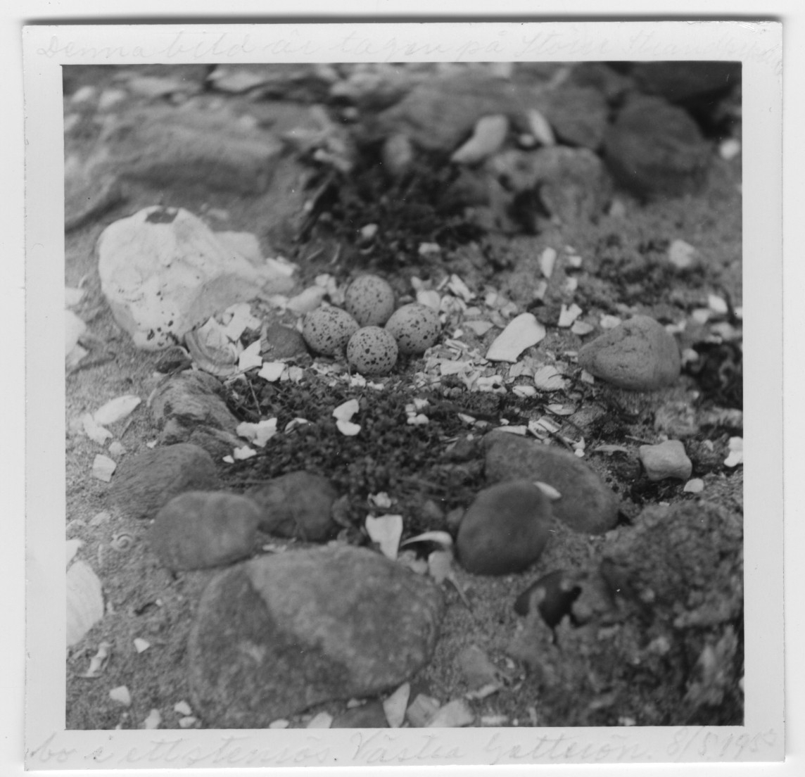 'Bo med 4 ägg av större strandpipare liggande bland mindre stenblock. :: :: Text på fotot: ''Denna bild är tagen på större strandpiparens bo i ett stenrös.'' :: :: Ingår i serie med fotonr. 4545:1-34.'