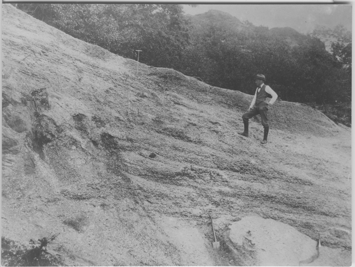 'Skalbank, spongieprofilen, ca 6 m mäktighet. En man står i lutningen. :: :: Serie fotonr 4818-4828'