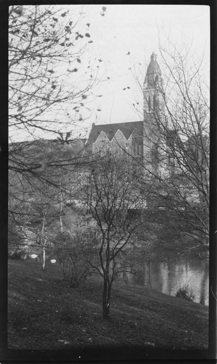 Fågeldammen med Annedalskyrkan i bakgrunden. Delvis dold av trädvegetation.