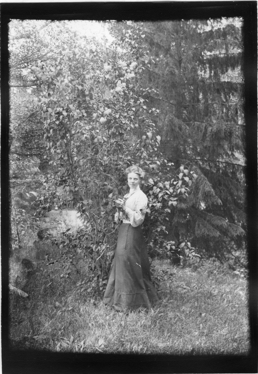 'Diverse fotografier från bl.a. dåvarande Nordrhodesia, nu Zambia, tagna av Konsul Magnus Leijer. :: :: En kvinna ståendes vid ett mindre träd, framför större lövträd och gran.'