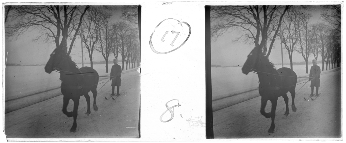 'Bildtext: ''Skidlöpare efter häst.'' :: 1 man på skidor iklädd mössa och rock, håller i tömmar bakom en häst med sele som drar honom. På en snöklädd väg ev. med allé. :: :: Ingår i serie med fotonr. 5253:1-18, se även hela serien med fotonr. 5237-5267.'